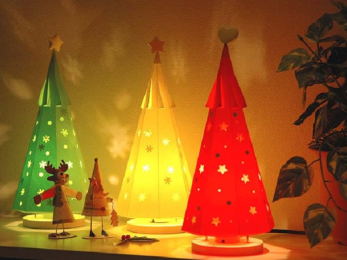 電球の熱(上昇気流)でシェードがくるくる回るあかりです。穴から漏れる光の模様が壁に映ってとてもきれいです。クリスマスシーズンにピッタリです。色は赤、緑、白の3色。紙だけの追加注文もできますので、いろんな色で作って被せ変えても楽しいですね。製作時間は約1時間です。