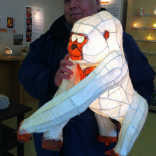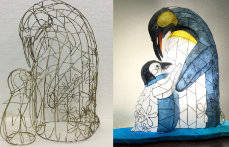 「灯芸クラス」の特筆すべきところは、「基礎クラス」のように初級からではなく、いきなり自由創作から始めるということです。難しそうに思われるでしょうが、実はこの方が上達が早いのです。しかも最初からハイレベルな作品が作れます。ペンギンの親子のあかりは、なんと第一作目なんです。働くお母さんがコツコツと作られました。