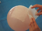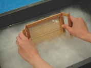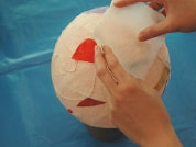 風船に和紙を貼って球状のあかりを作ります。自分で和紙を漉く所からやるので人気の高い作品です。和紙を貼る時に間に色和紙などを挟み込み模様をつけます。この模様で作る人の個性が出ます。シンプルな形なのでどんなお部屋にも合います。和紙漉きは小学1年生でもできます。むしろ子供達の方が大人より上手いくらいです。