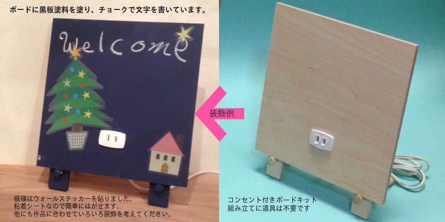 ナイトライトの作品を作ったら、コンセント付きのボードに取り付けてみませんか。使い方がグンと広がります。ご自宅なら玄関で、お店なら店頭で季節ごとにあかりを変えて演出できます。